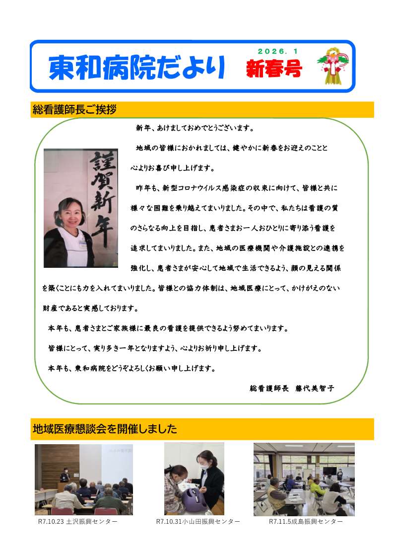 東和病院だより 2026年1月新春号 2025年9月号 2025年春号 2024年冬号 2024年夏号 2024年春号 2024年冬号 2023年秋号 2023年夏号 2023年春号 2023年冬号 2022年秋号 2022年夏号 2022年 春号